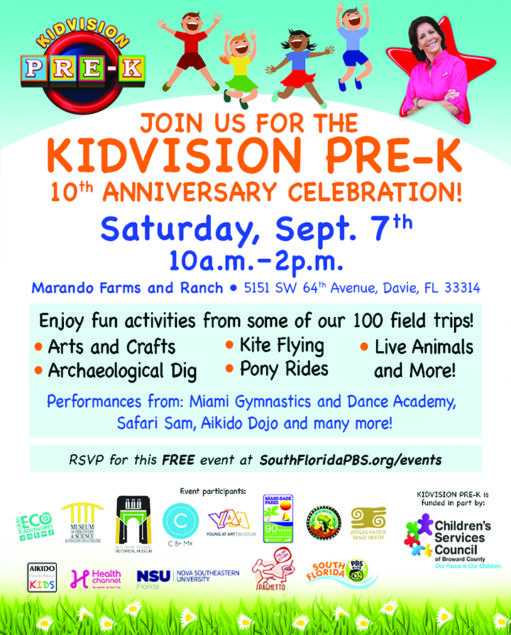 PBS kicks off the month with the 10th year anniversary celebration of KidVision Pre-K which entails the creation of 100 virtual field trips for children to enjoy and learn from. The celebration will take the form of a complimentary party for the entire South Florida community on Saturday, September 7 from 10 a.m. to 2 p.m. at Marando Farms and Ranch in Davie. Families will enjoy all sorts of activities derived from some of the 100 field trip locations: arts and crafts, petting zoo, hay rides, performances on stage, pony rides, an archaeological dig, kites and much more.