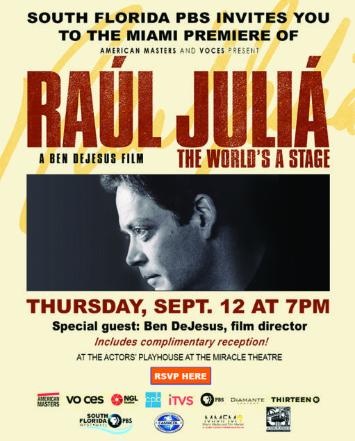 ● Thursday the 12th at 7 p.m. Raúl Juliá: The World’s a Stage, a co-presentation of Voces and American Masters at The Actors Playhouse at The Miracle Theatre in Coral Gables. Come learn about the life of Raul Julia with special guest, the film director: Ben DeJesus.