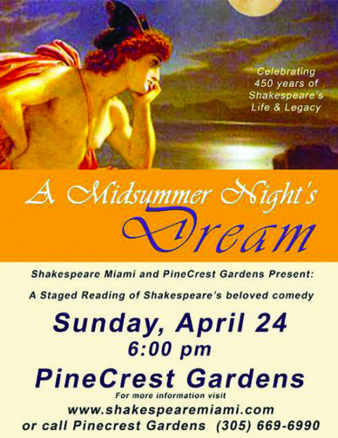 In conjunction with Shakespeare companies across the Globe and the Folger Shakespeare Library, Shakespeare Miami will present a costumed staged reading of Shakespeare’s sparkling comedy. Do dreams influence reality? Shakespeare Miami takes us into the magical woods where a group of fairies hilariously fumble in their attempts to manipulate the lives of ordinary people. This program celebrates the legacy of William Shakespeare whose comedic masterpiece A Midsummer Night’s Dream has influenced directors, composers, authors, choreographers, and painters across four centuries. This production is a costumed staged reading performed by professional actors, and directed by Colleen Stovall, Shakespeare Miami’s Producing Artistic Director. Shakespeare Miami is a partner Theatre of the Folger Shakespeare Library. This production was made possible with the support of Pinecrest Gardens, the State of Florida Culture Builds Florida program, The Frank and Susan Salinger Fund for the Arts.