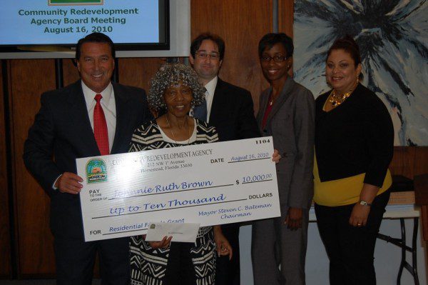City of Homestead Mayor Steven Bateman, Vice-Mayor Judy Waldman, and City Council leaders along with the Community Redevelopment Agency (CRA) staff presented nine families close to $100,000 in grant money to improve their homes. The goals of these programs are to improve the quality of life for homeowners and residents, bring properties up to current building code, improve and upgrade the appearance of the area, and facilitate and encourage redevelopment activity in the area.