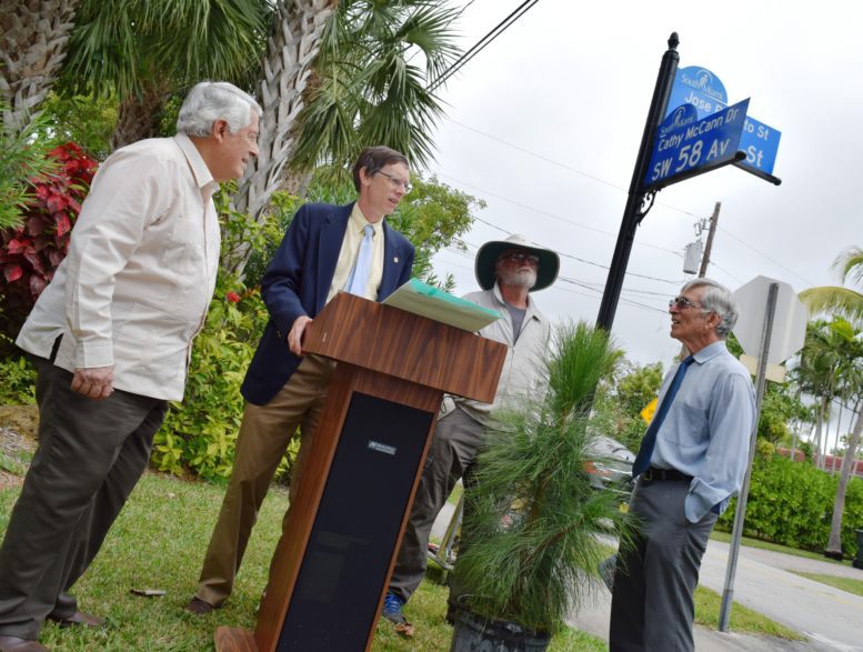 The resolution to install new “Jose Basulto Street” signs, sponsored by Commissioner Walter Harris, was passed late last year by both the City of South Miami Commission and County Commission. A morning ceremony was well attended by neighbors, friends, and supporters – among them South Miami Mayor Phil Stoddard and Commissioners Josh Leibman and Bob Walsh, whom addressed the group just down the street from Basulto’s home.