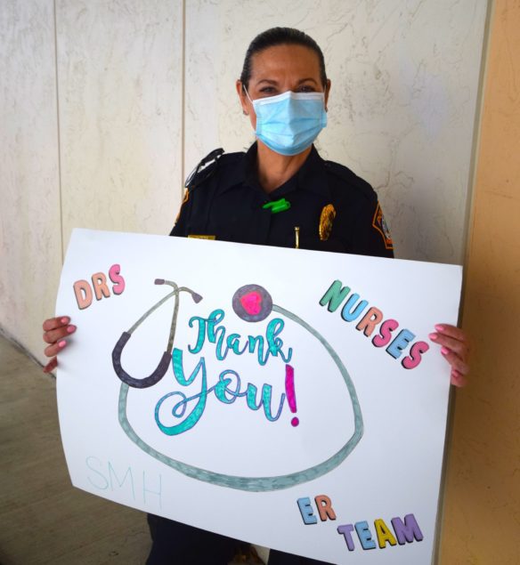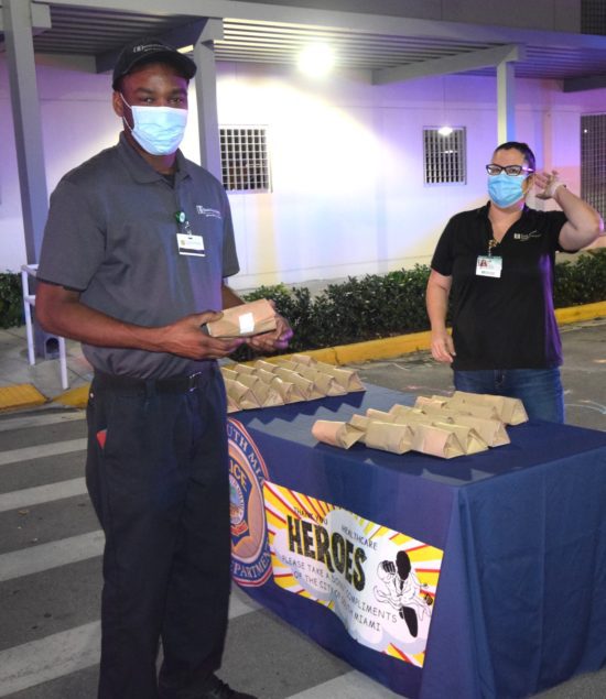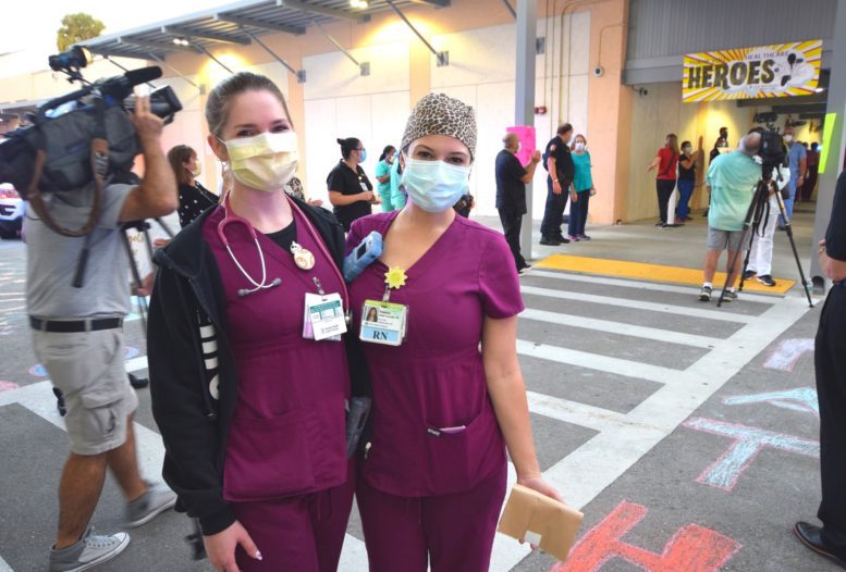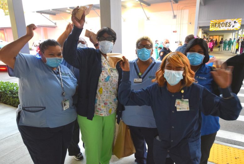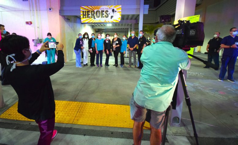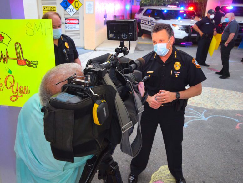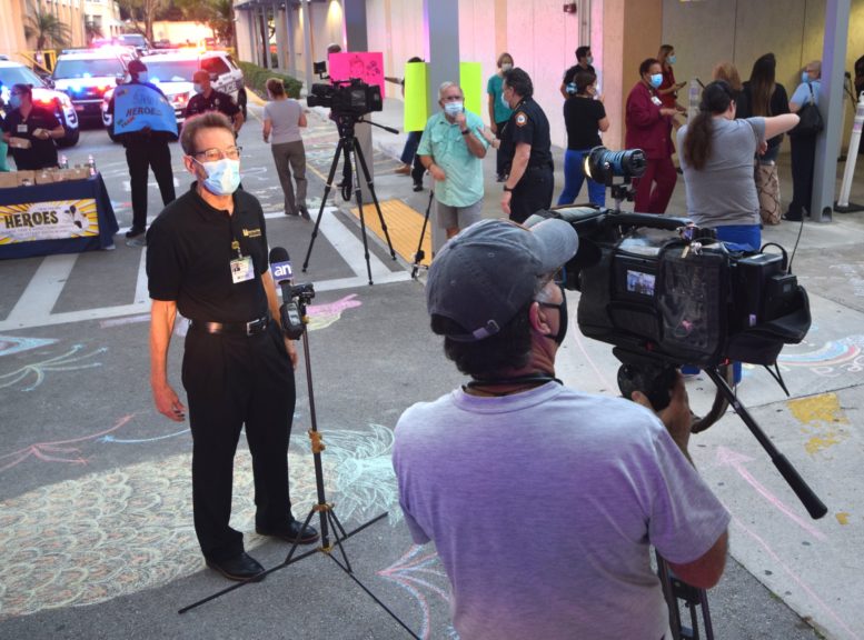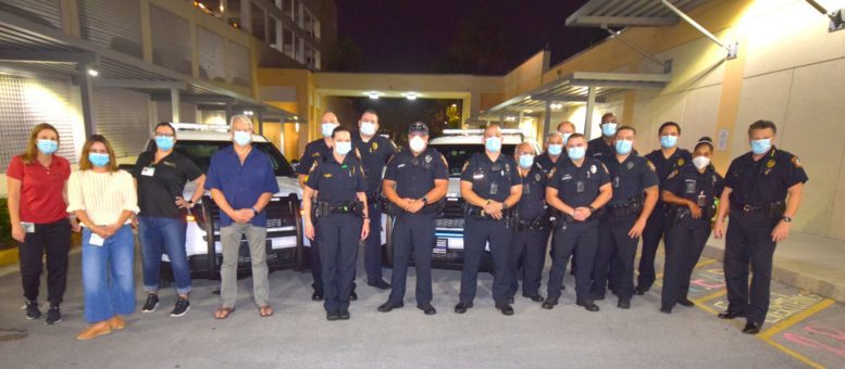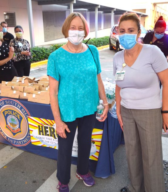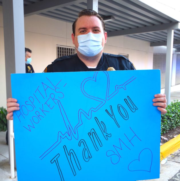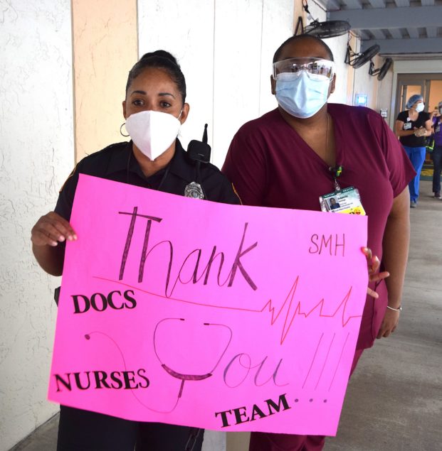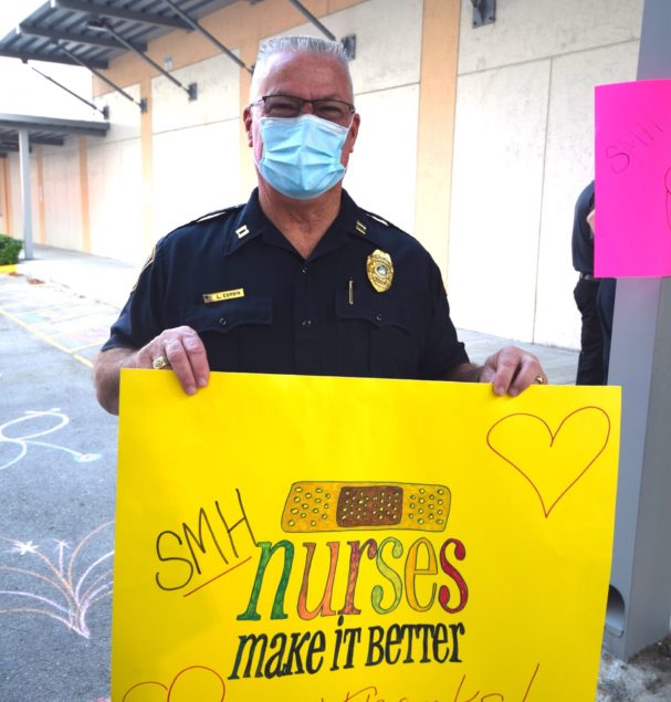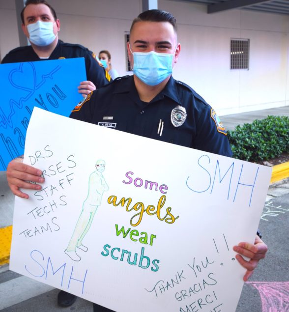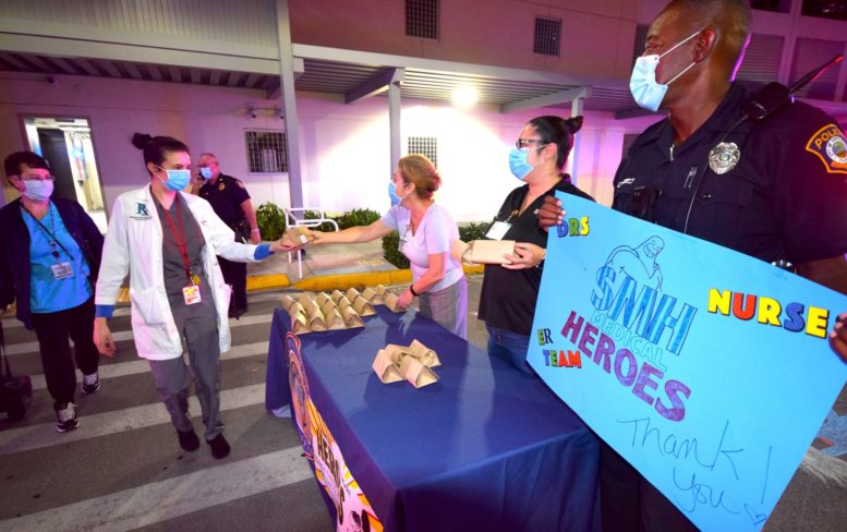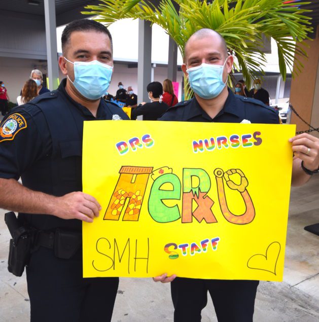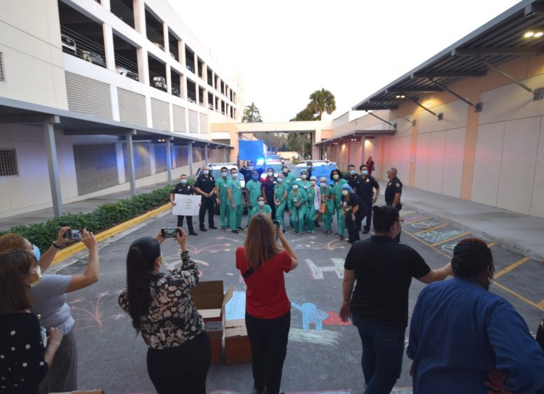 Officers with the City of South Miami Police Department lined up at the hospital’s employee entrance to cheer staffers who were either starting or ending another day on the front lines. They were joined by South Miami Mayor Sally Philips and members of the City Commission, as well as officials from the City Manager’s office who hosted the event.