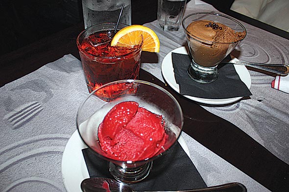 Raspberry Sorbet and Chocolate Mousse with a Campari and Soda
