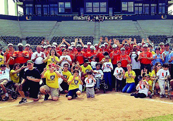 The Miracle League kids played a special game on the field at UM’s Mark Light Field on Saturday, Mar. 9. Hurricanes head coach Jim Morris and the Hurricanes baseball team wanted to be involved in this project and offered their time and expertise to buddy the special needs children of the Miracle League.