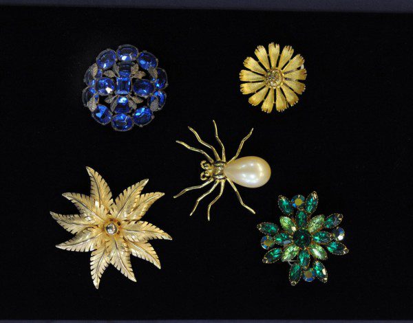A newly released selection of vintage brooches – from $35 – $95 – comes in crystals, rhinestones and faux pearls to name a few. A stately 1920s crystal necklace ($255) looks as stunning as diamonds but without the price.