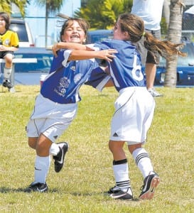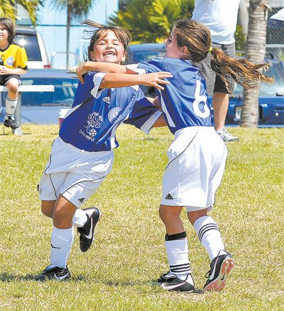 Little Angels South Miami Soccer teammates Olivia Borroto and Victoria Quimber celebrate after making a goal.