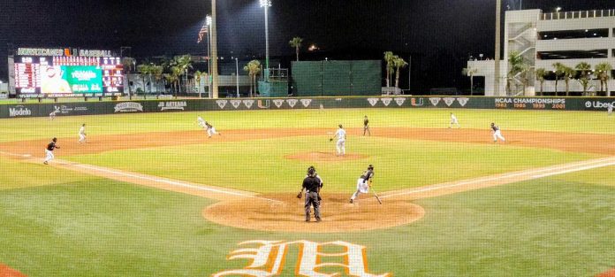 After two scoreless innings, the Knights struck with an opening double, scoring on a two-out single. You could almost hear a pin drop as Miami came to the plate trailing by one. The silence was broken with Alvarez leading off with a double, energizing the dugout and fans. A lull after Brandon DeGoti striking out, and time was running out on the Canes. That was all about to change as freshman Vance Sheahan came to the plate. The Mark Light Miracle would not be spoiled a third time as Vance, with a 3-1 count, swings, sending the ball deep, deep into left, soaring over the scoreboard, clearing the dugout, and the fans going wild over this unbelievable comeback that at one point they were hitless going into the 7th and trailing by 5 in the 8th. This was the mark Light Miracle at its best.