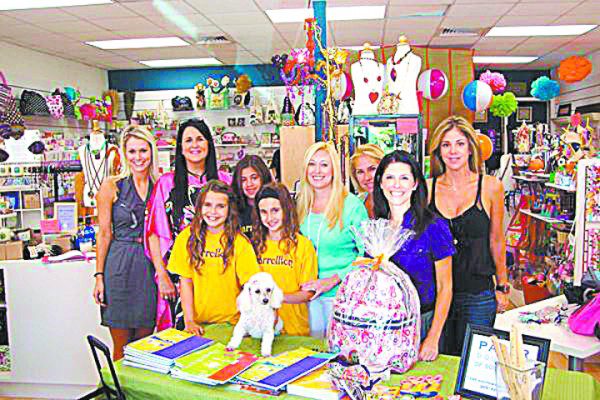 Mission Backpack volunteers gather at Paper Boutique in South Miami. Pictured are student volunteers from Carrollton School along with Molly Simmons of the FBCH; Sara George, owner of Paper Boutique; Susan Isenberg, Mission Backpack coordinator; Nicole Maristany Krauss; Christine Weil, and Beba Padron along with the store’s official mascot, Poodee George.