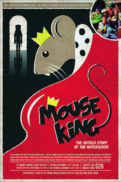 Conceived and created by renowned puppeteer Noel MacNeal – a leading light behind television’s Sesame Street and Disney’s Bear in the Big Blue House – and featuring original music written by South Florida’s highly acclaimed musician and composer Jim Camacho, Mouse King revisits the story of the seasonal favorite The Nutcracker, while adding an entirely different twist.