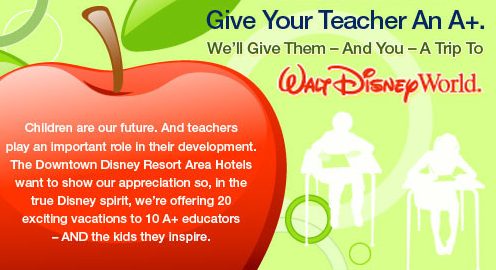 The contest asks participants to nominate their favorite teacher, with winning educators and the students who nominate them each receiving a four-day, three-night vacation trip to one of the seven Downtown Disney Resort Area Hotels.