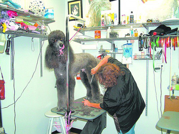 Pet groomer Jackie Wosar completes the final touches on Standard Poodle Bo
