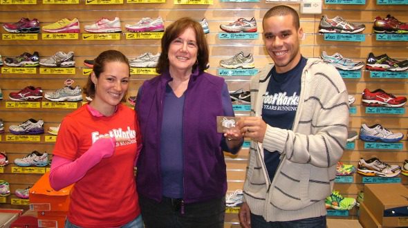 Donna Shelley (center), won the FootWorks & Community Newspapers contest and received a $150 gift certificate to FootWorks and promptly bought her Brooks Women’s Ariel Running Shoes.