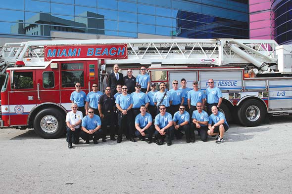 To make the check presentation, approximately 30 City of Miami Beach Fire Rescue employees arrived to Mount Sinai on fire trucks, sporting full mustaches and light blue T-shirts, the color for prostate cancer awareness.