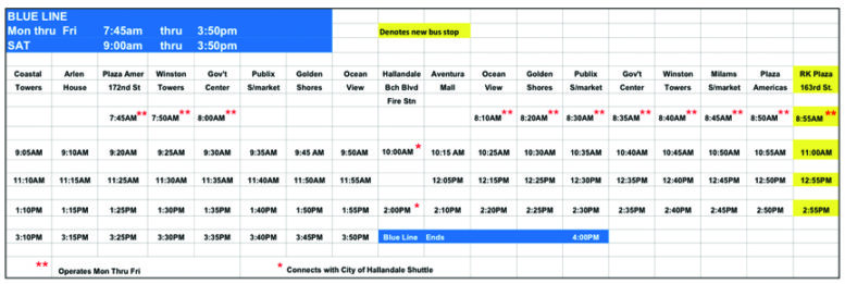 Effective November 1, 2013, the Blue Line will travel over the bridge after its Plaza of the Americas stop, going past the Intracoastal Mall and directly to the RK Plaza at 163rd Street. To get there, you need to get on the Blue Line before or at Plaza of the Americas. You will arrive at this RK plaza or can be picked up from there Monday – Saturday at 8:55 a.m., 11:00 a.m., 12:55 p.m. or 2:55 p.m. After that stop, the route will cross back over the Intracoastal and resume its regular southbound route with its next scheduled stop at Coastal Towers.