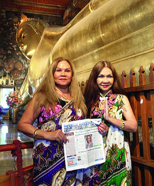 On a recent vacation to Thailand, Anh Kaul and sister Mong Hoa hold a copy of the Sunny Isles Beach Sun Community Newspaper at various spots around the complex where the Temple of the Reclining Budda resides. The giant reclining Buddha measures 46 meters long and is covered entirely in gold leaf. This popular location is a short walk from the Grand Palace and is a very relaxing way to end a day of touring. The complex is also a great place to get a traditional Thai massage. Wat Pho is one of the leading schools of massage in Thailand.