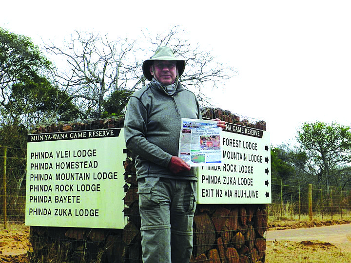 Irving Feder took an issue of the Sunny Isles Beach Sun Community Newspaper on Safari this October to the Phinda Private Reserve near Kruger National Park in South Africa (John Getty has a house on this property). “The reserve is situated in subtropical northern KwaZulu-Natal, with close proximity to the warm Indian Ocean and is home to seven unique ecosystems. It is an award-winning game reserve with a strong focus on conservation and community involvement.” Guests on the reserve can view wildlife in a natural habitat.
