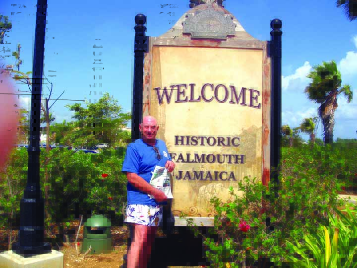 Irving Feder holds a copy of the Sunny Isles Beach Sun Community Newspaper at the Falmouth Historic District, Jamaica. The District contains the largest intact collection of British Colonial architecture in the Caribbean. The original structures followed English design books. Slave labor was used to build this port town as a harbor for sailing ships and the area landowners became wealthy from exporting sugar and rum and importing slaves. In later years, larger ships bypassed Falmouth Harbour because it was too shallow and the town fell into disrepair and suffered even more after a direct hit from Hurricane Gilbert in 1988. In 2001, Falmouth Heritage Renewal began its preservation efforts with the goal of restoring and saving the Falmouth Historic District. This effort has encouraged tourism and helped regrow the economy.