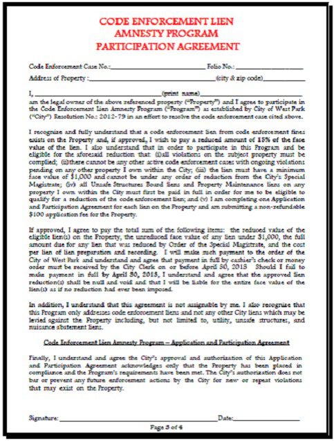 The City of West Park has established a period of Code Enforcement Liens and Accrued Fines Amnesty that would address the back-log of liens on record/daily fines accruing and sought to provide relief to the property owners. Also, this Code Enforcement Liens and Accrued Fines Amnesty Program will be beneficial in achieving the goal of compliance and it will further serve a public benefit by increasing property value throughout the city.