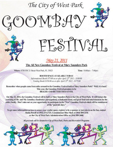 Come join us on Saturday, May 21 at Mary Saunders Park, 4750 SW 21 Avenue, West Park, for the 2011 Goombay Festival!